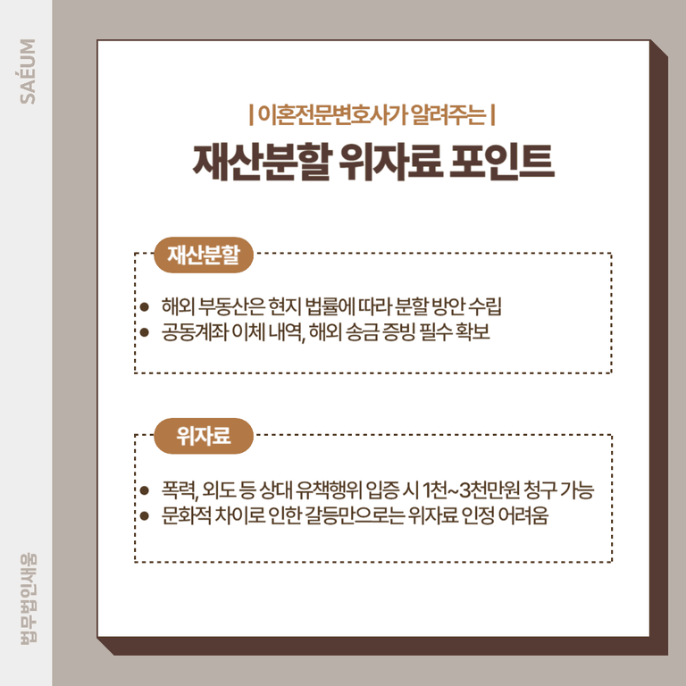 재산분할: 해외 재산이 있을 경우 국제사법에 따른 법률 충돌 문제가 발생할 수 있습니다.