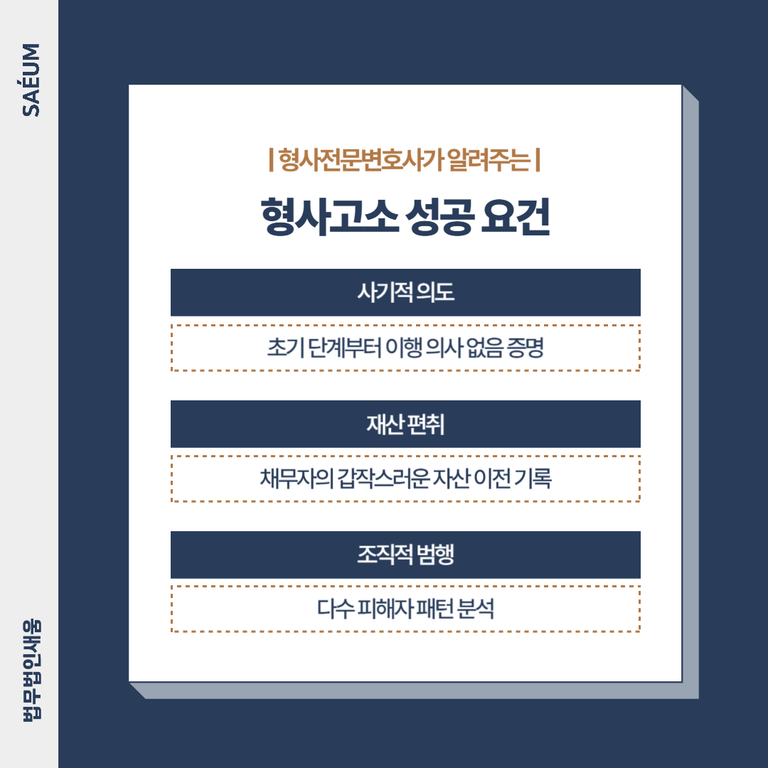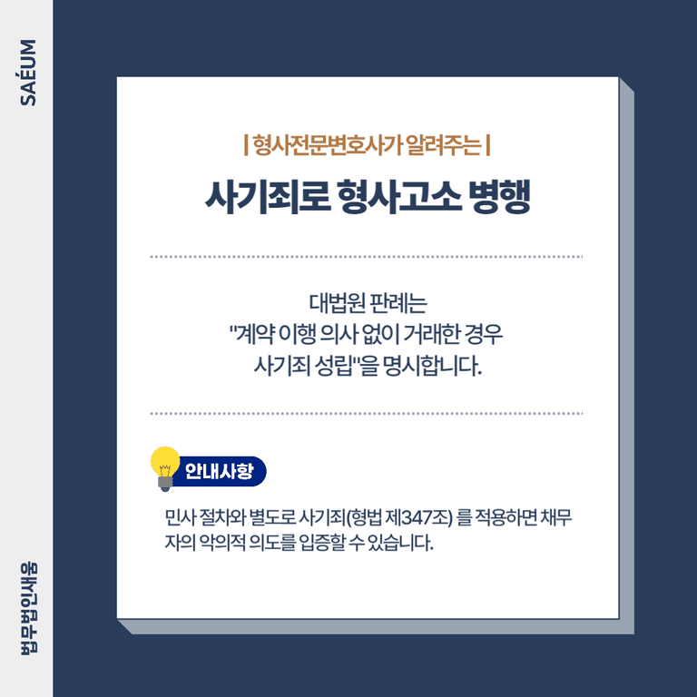 민사 절차와 별도로 사기죄(형법 제347조) 를 적용하면 채무자의 악의적 의도를 입증할 수 있습니다. 2024년 7월 대법원 판례는 "계약 이행 의사 없이 거래한 경우 사기죄 성립"을 명시했습니다.