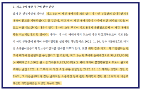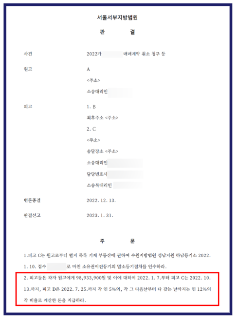 결국 서울서부지방법원은 이 사건 매매계약을 취소하고, 피고 B는 원고에게 매매대금 9천만 원과 등기 비용 전액 893만 원, 그리고 이에 대한 지연손해금까지 지급하라는 원고 승소판결을 내렸습니다.