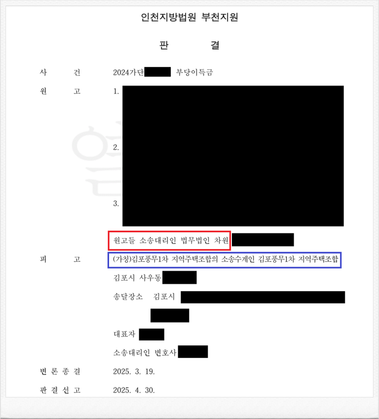 그러나, 가입 후 피고 김포풍무1차 지역주택조합 측이 진행하는 사업이 계획대로 진행되지 않았고, 이에 의뢰인들은 정식 민사소송을 통하여 기 납입한 각 금원의 반환을 원하였습니다.