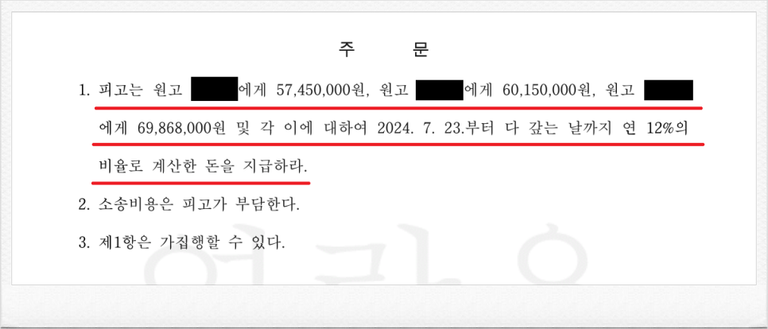 결국, 재판부는 이러한 저의 주장을 받아들였고, 피고는 의뢰인들에게 각 분담금 및 이에 대한 지연손해금을 지급하라는 내용의 판결을 선고하였습니다.