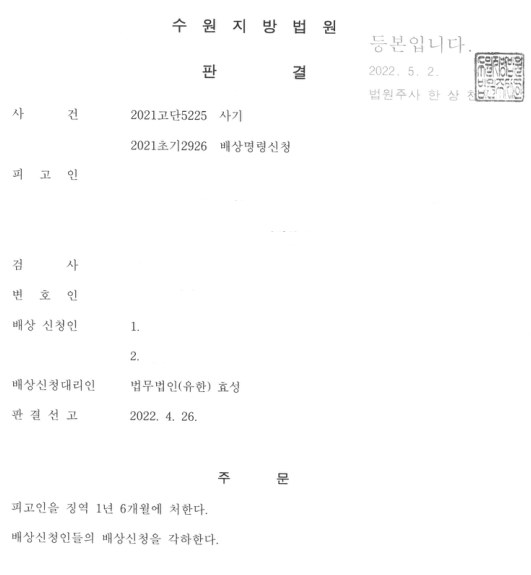 4. 피고인은 초범임에도 불구하고 1년 6개월의 실형을 선고받았고, 의뢰인은 민사소송에서도 전부 승소하였습니다.
