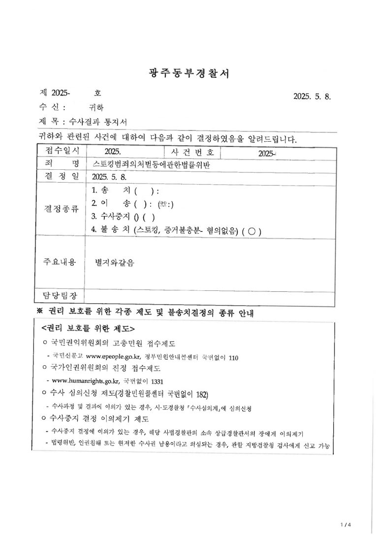 그때 스토킹 불송치 사례 소개드린다고 했는데, 지금 소개드립니다.