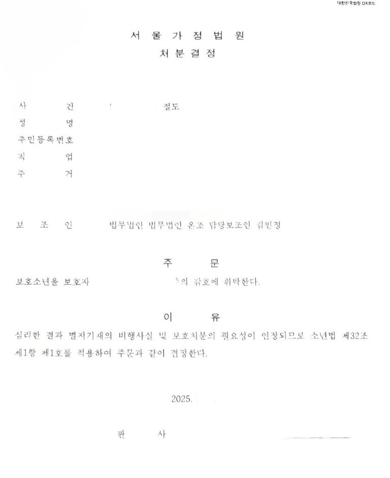 이 사건은 깔끔하게 “1호 처분”으로 끝났습니다. 수강명령이나 사회봉사, 보호관찰처분이 병과되지 않았습니다. 부모님께서 무척 고마워하셨습니다. 합의만 되었으면 불처분으로 끝날 수 있었기에 보조인으로서 내심 그 부분이 아쉽습니다. 소년보호처분은 전과도 남지 않고 피해자측에서 처분결과를 알 수도 없기 때문에 안심하고 일상으로 복귀하시면 됩니다.
