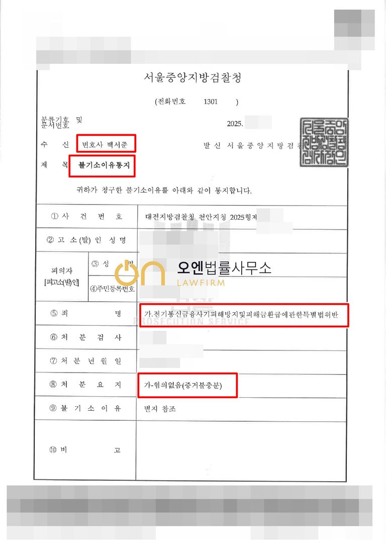 검찰은 담당변호사의 주장을 받아들여, 혐의없음(증거불충분)의 불기소처분을 하였습니다.