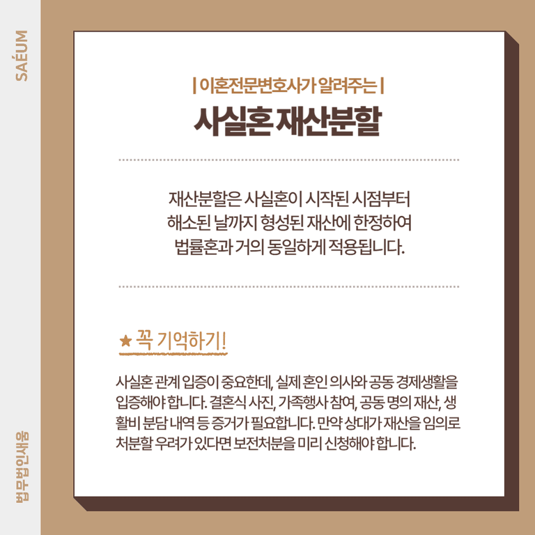 사실혼 해소를 앞두고 재산분할을 고민하고 있다면, 지금 바로 전문가 상담을 받아보시길 권합니다.