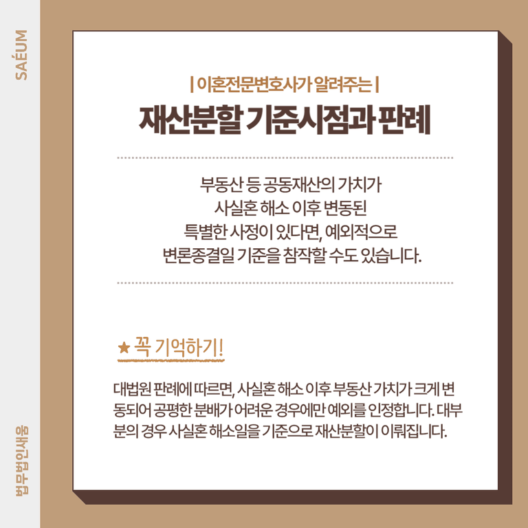사실혼 해소로 인한 재산분할의 기준시점은 원칙적으로 사실혼이 해소된 날입니다. 다만, 부동산 등 공동재산의 가치가 사실혼 해소 이후 변동된 특별한 사정이 있다면, 예외적으로 변론종결일 기준을 참작할 수도 있습니다. 최근 대법원 판례에 따르면, 사실혼 해소 이후 부동산 가치가 크게 변동되어 공평한 분배가 어려운 경우에만 예외를 인정합니다. 대부분의 경우 사실혼 해소일을 기준으로 재산분할이 이뤄집니다.