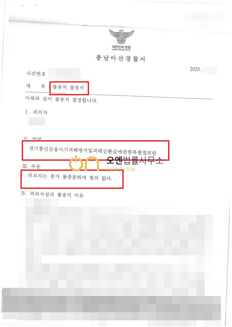 수사기관은 담당변호사의 주장을 받아들여, 불송치 결정(혐의없음)을 하였습니다.