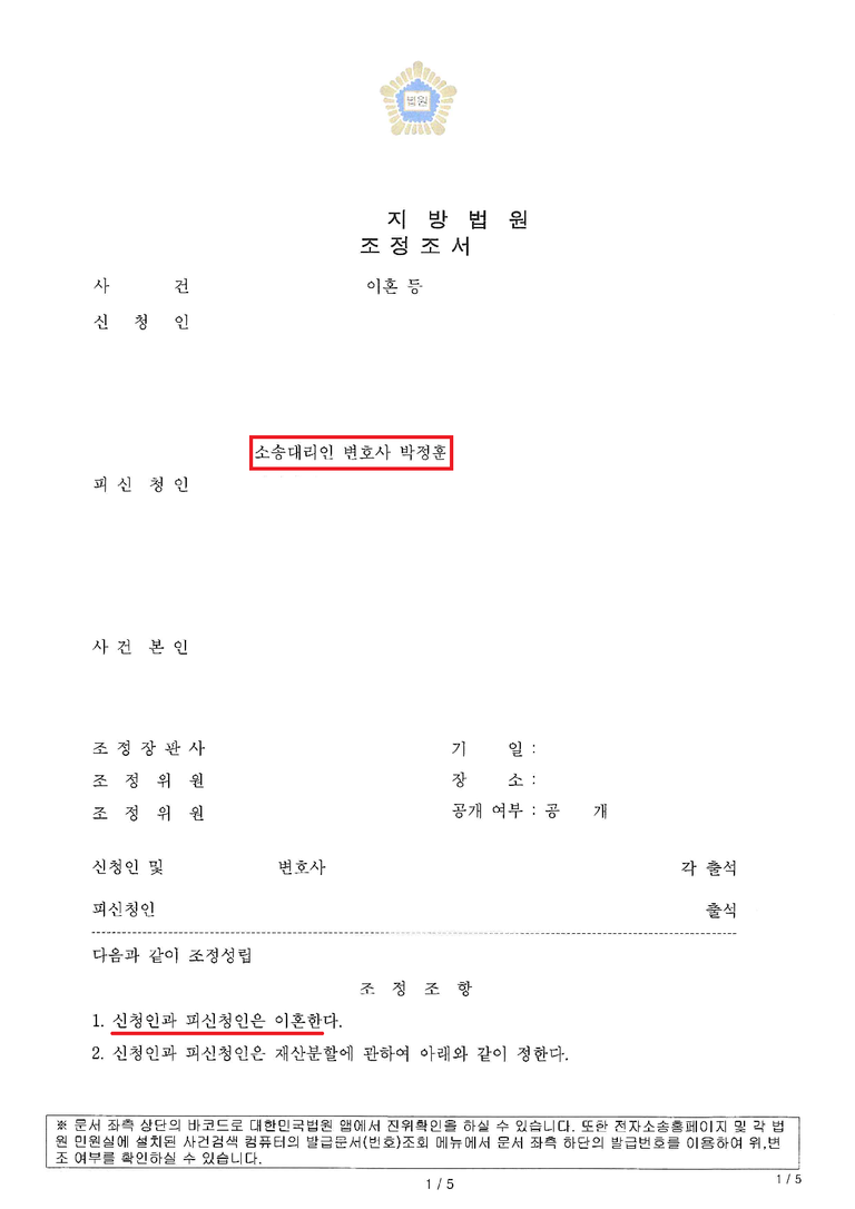 ⑤ 조정 기일을 1회 진행하여 2개월 만에 빠른 이혼 마무리해 드린 사안입니다.