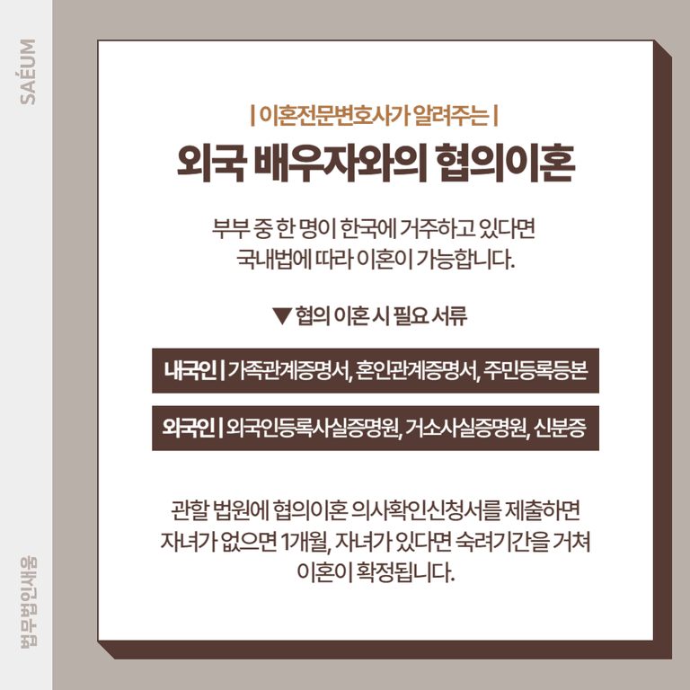 외국인 배우자와 이혼할 때도 국내법상 협의이혼 절차를 따를 수 있습니다. 국제사법 제39조에 따르면, 부부가 동일한 상거소지법을 따르거나, 밀접하게 관련된 국가의 법을 적용받게 됩니다. 부부 중 한 명이 한국에 거주하고 있다면 한국법에 따라 이혼이 가능합니다.
