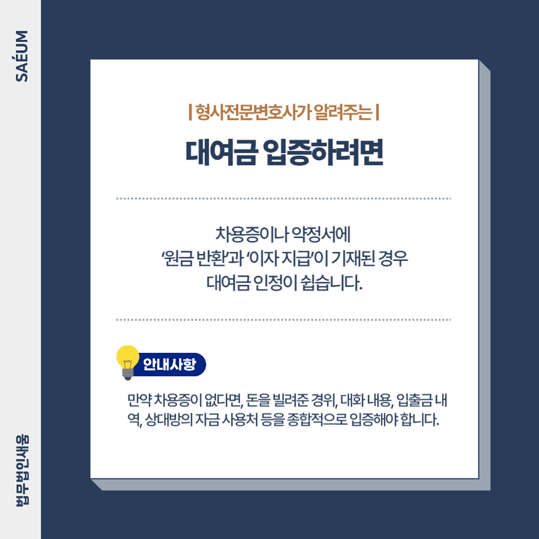이처럼 대여금 반환 소송에서는 차용증, 계좌이체 내역, 문자, 통화 녹음 등 다양한 증거를 확보하고, 투자금이나 증여가 아님을 명확히 입증하는 것이 중요합니다.