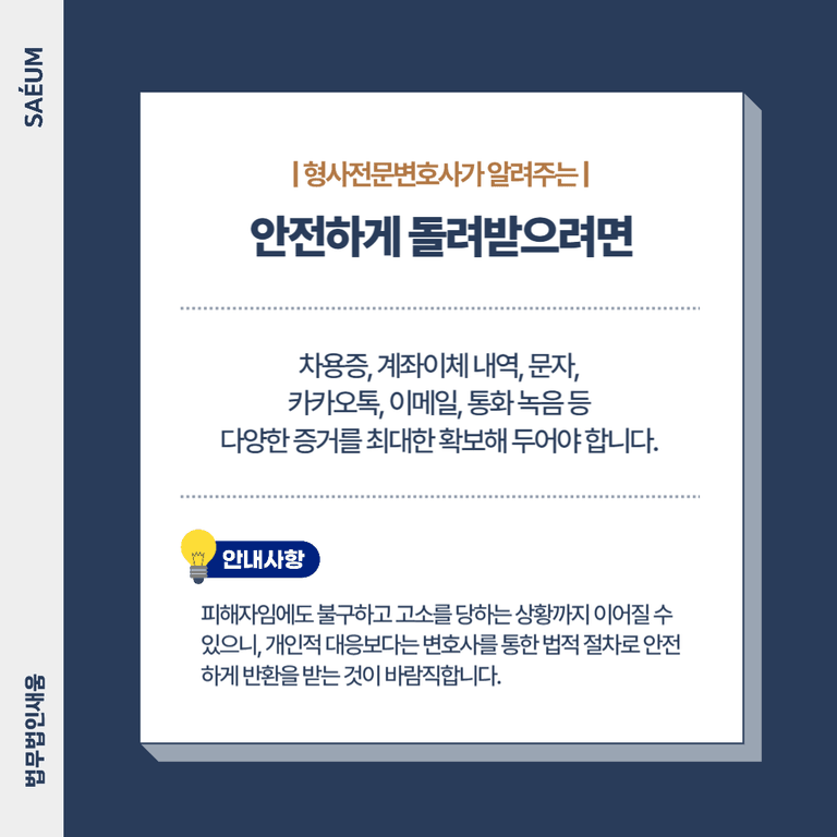 억울하게 돈을 돌려받지 못한 경우, 개인적으로 대응하기보다 변호사와 상담해 증거를 정리하고 법적 절차에 따라 대응하는 것이 가장 안전합니다. 차용증, 계좌이체 내역, 문자 등 입증 자료를 최대한 확보하고, 내용증명·지급명령·소송·강제집행 등 단계별 대응 전략을 세워야 합니다.