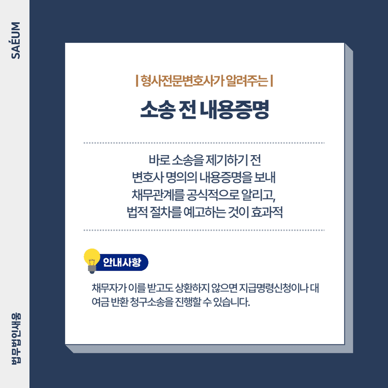 바로 소송을 제기하기 전에는 변호사 명의의 내용증명을 보내 채무관계를 공식적으로 알리고, 법적 절차를 예고하는 것이 효과적입니다. 채무자가 이를 받고도 상환하지 않으면 지급명령신청이나 대여금 반환 청구소송을 진행할 수 있습니다. 지급명령은 상대방이 이의신청을 하지 않으면 바로 집행이 가능해 시간과 비용을 줄일 수 있습니다. 다만, 이의신청이 들어오면 정식재판으로 넘어갑니다.
