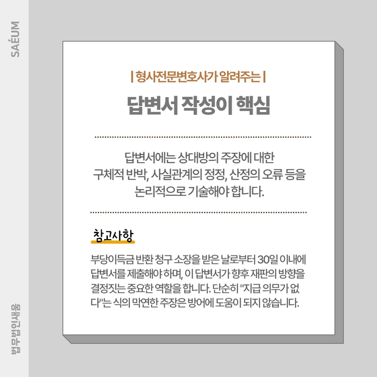 부당이득금 청구에 제대로 대응하지 않으면, 실제보다 과도한 금액을 반환해야 하는 불이익을 입을 수 있습니다. 소송이 시작되면 즉시 형사전문변호사와 상담해, 상대방의 청구 내용과 증거를 꼼꼼히 검토하고, 논리적이고 체계적인 답변서와 방어 전략을 마련해야 합니다.