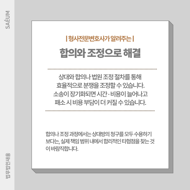 합의나 조정 과정에서는 상대방의 청구를 모두 수용하기보다는, 실제 책임 범위 내에서 합리적인 타협점을 찾는 것이 바람직합니다. 변호사의 조력을 받으면 상대방과의 협상에서 유리한 조건을 이끌어낼 수 있고, 불필요한 분쟁을 예방할 수 있습니다.