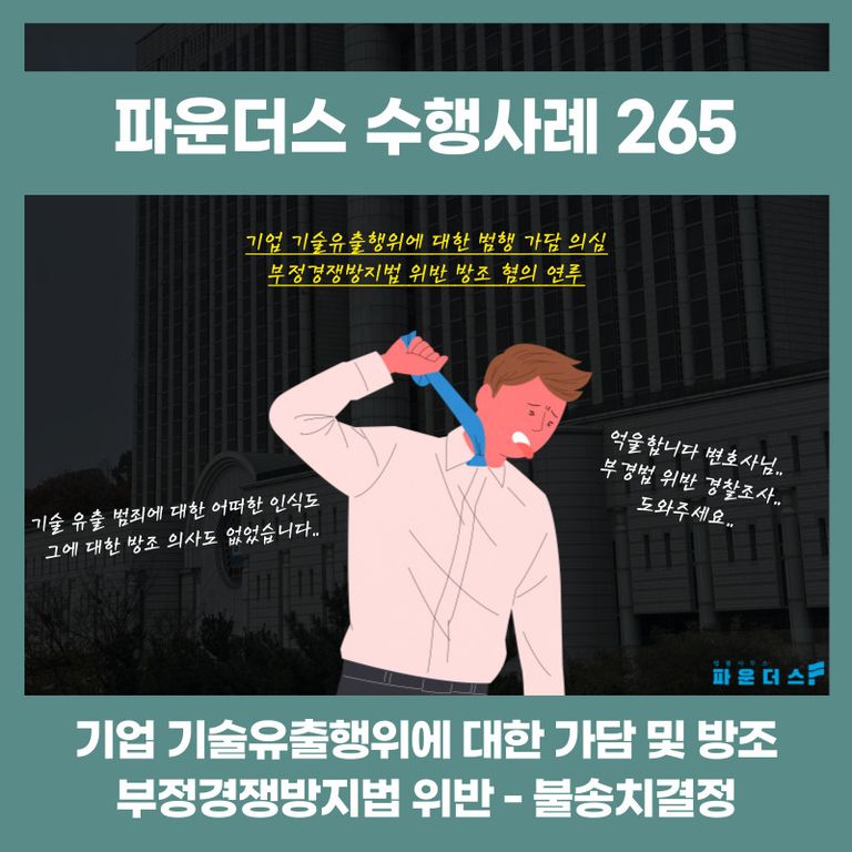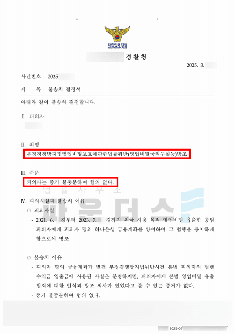그 결과 기업 기술유출행위에 대한 가담 의심 정황으로 부경법 위반 방조 혐의를 받게 된 의뢰인은 불송치결정의 결과로 경찰단계에서 사건을 조속히 마무리 지을 수 있었습니다.
