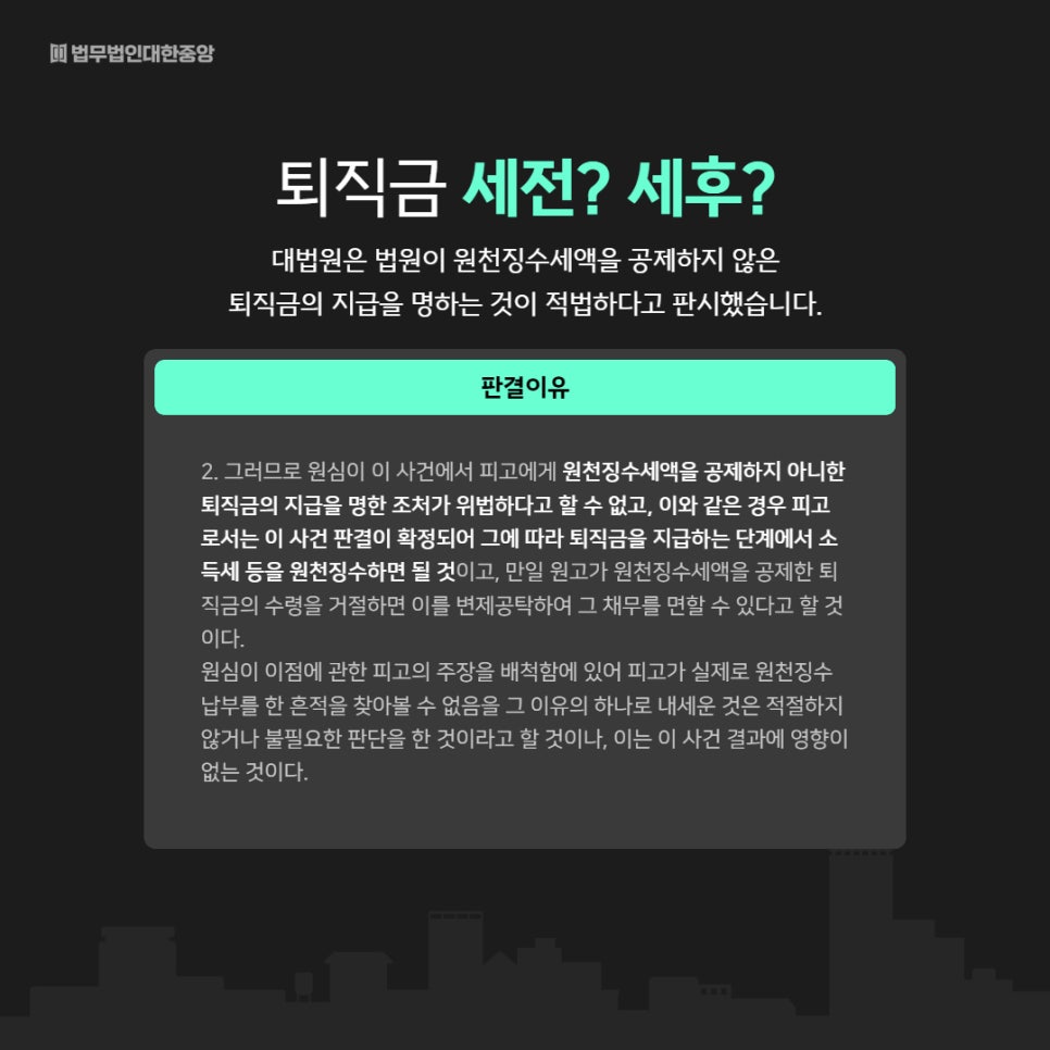 대법원은 퇴직금 청구 소송에서 법원이 원천징수세액을 공제하지 않은 퇴직금의 지급을 명하는 것이 적법하다고 판시했습니다. 사용자는 판결 확정 후 퇴직금을 지급하는 단계에서 소득세 등을 원천징수하면 된다는 원칙을 확립했습니다.(대법원 1992. 5. 26. 선고 91다38075 판결)