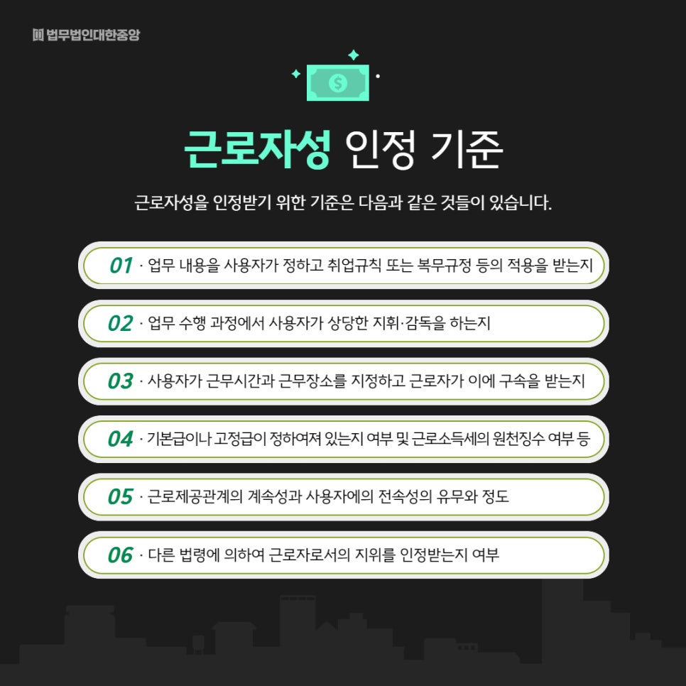 근로자성을 인정받기 위한 기준은 다음과 같습니다. 다만 이를 입증하기가 복잡해서, 노동전문변호사와 상담을 받아보시는 것이 좋겠습니다.