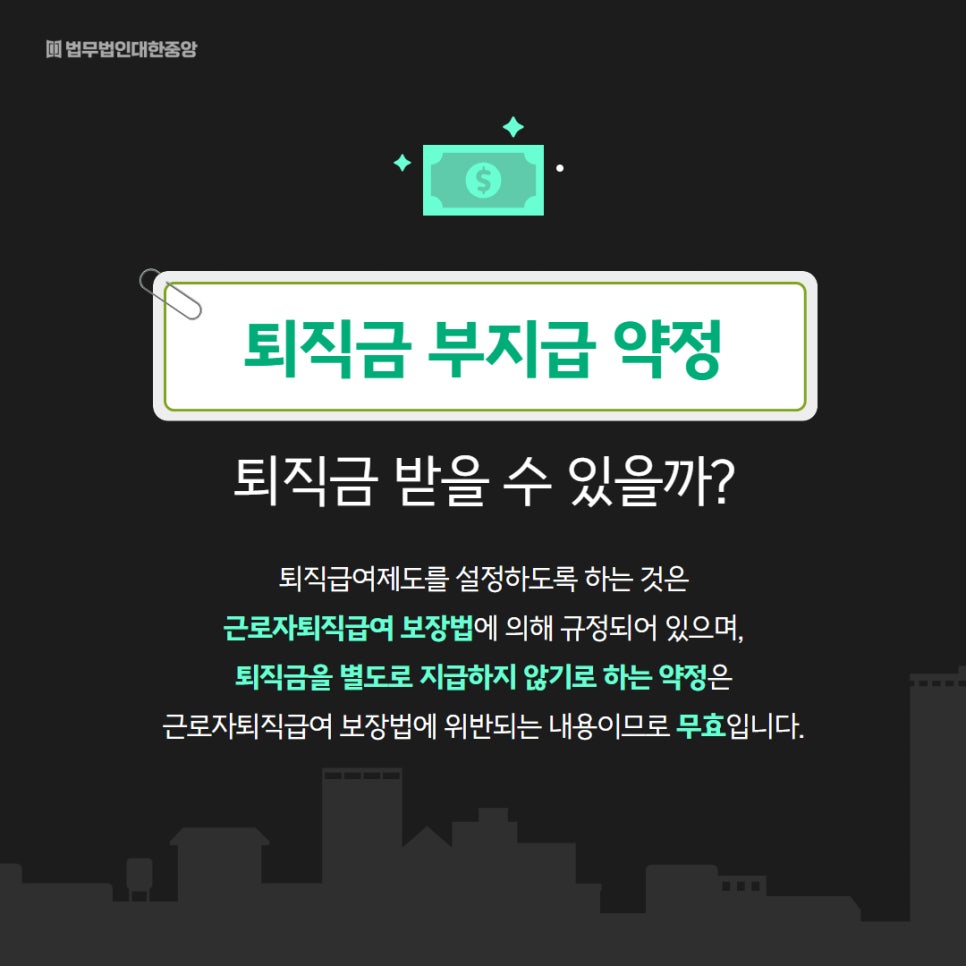 퇴직급여제도를 설정하도록 하는 것은 근로자퇴직급여 보장법에 의해 규정되어 있으며, 퇴직금을 별도로 지급하지 않기로 하는 약정은 근로자퇴직급여 보장법에 위반되는 내용이므로 무효입니다. 때문에 그러한 약정이 있는 경우에도 퇴직금을 받을 수 있습니다.
