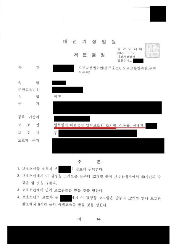 이동규 변호사의 조력으로 소년은 1호, 2호, 4호 처분 결정을 받았습니다. 이는 음주운전, 무면허 운전을 동시에 한 소년에게 정말 내려지기 어려운 가벼운 처분이었습니다.