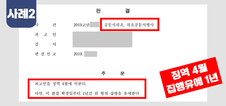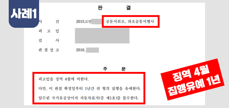 (공문서 위조 및 위조 공문서행사 징역4월, 집행유예 1년 실제판결)