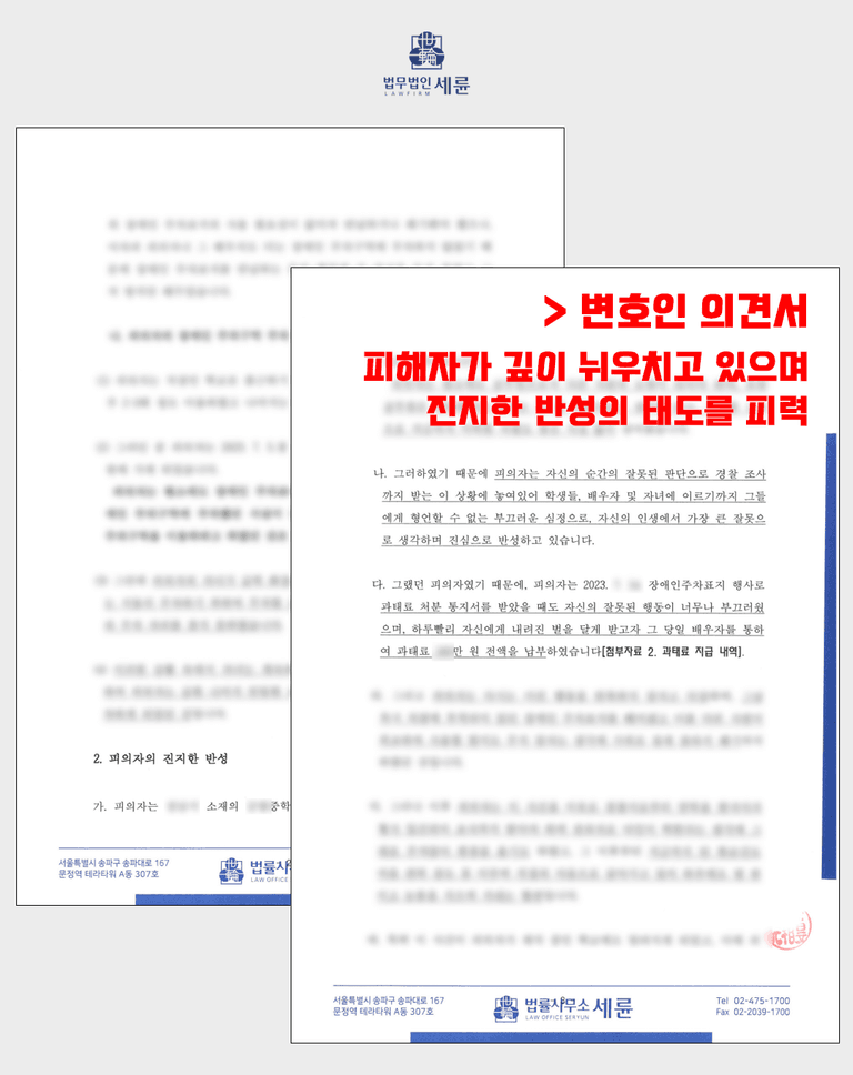 변호인 의견서를 통해 의뢰인이 진심으로 반성하고 있는 점들을 세세한 근거를 들어 기재하였고, 장애인 인권에 관한 연수교육을 신청하여 장애인에 대한 인식을 새롭게 바라보고 있다는 점, 15년간 학교 선생님으로 근무하여 공무원으로써 부끄러움을 느끼고 진지한 반성을 하고 있다는 점 등을 기재하여 경찰서에 제출하였습니다.