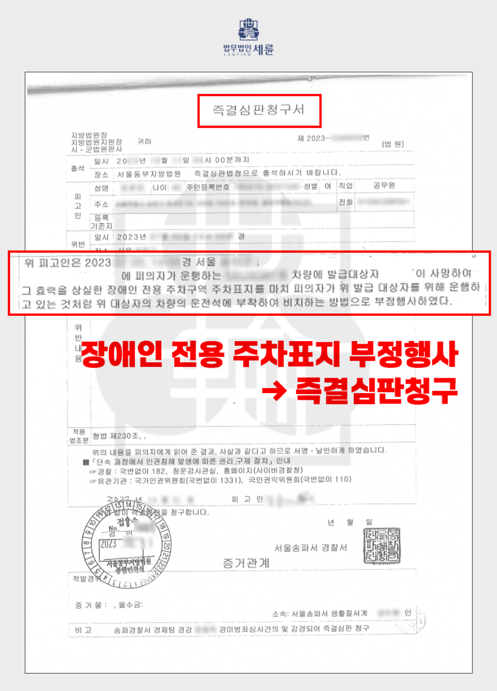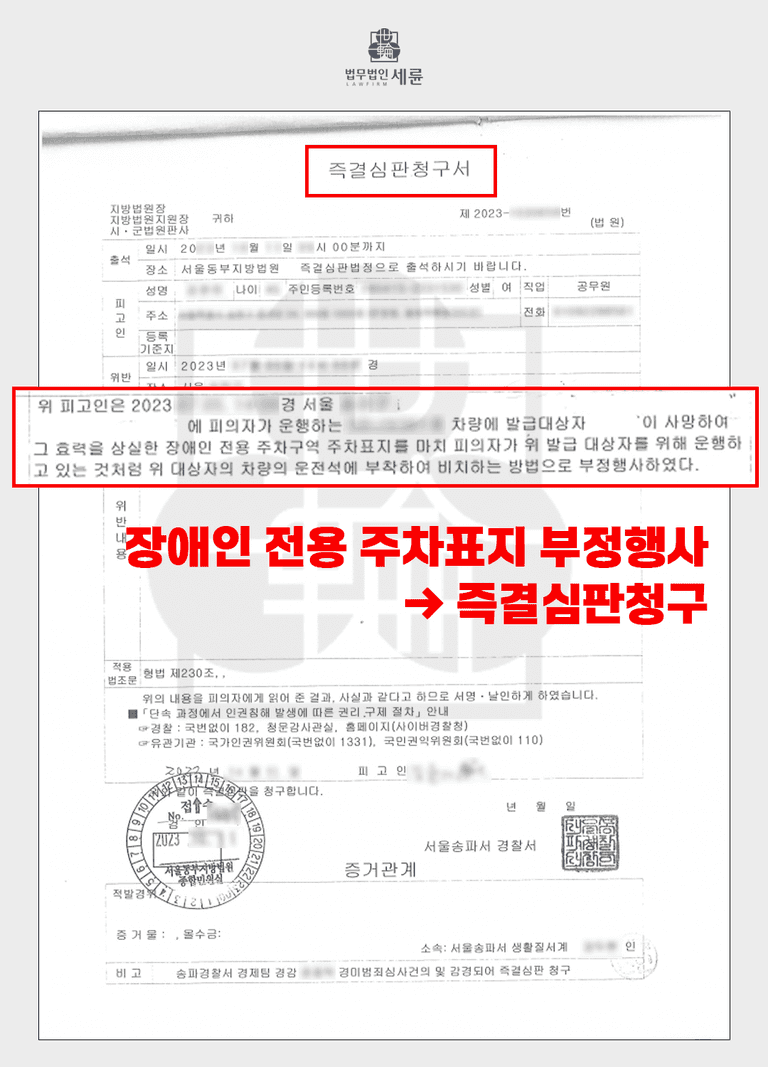 장애인 주차표지 위반으로 공문서 위조 및 변조, 공문서부정행사와 같은 혐의를 받고 계신다면 저희 세륜 법무법인과 상담을 해 보시길 바랍니다.