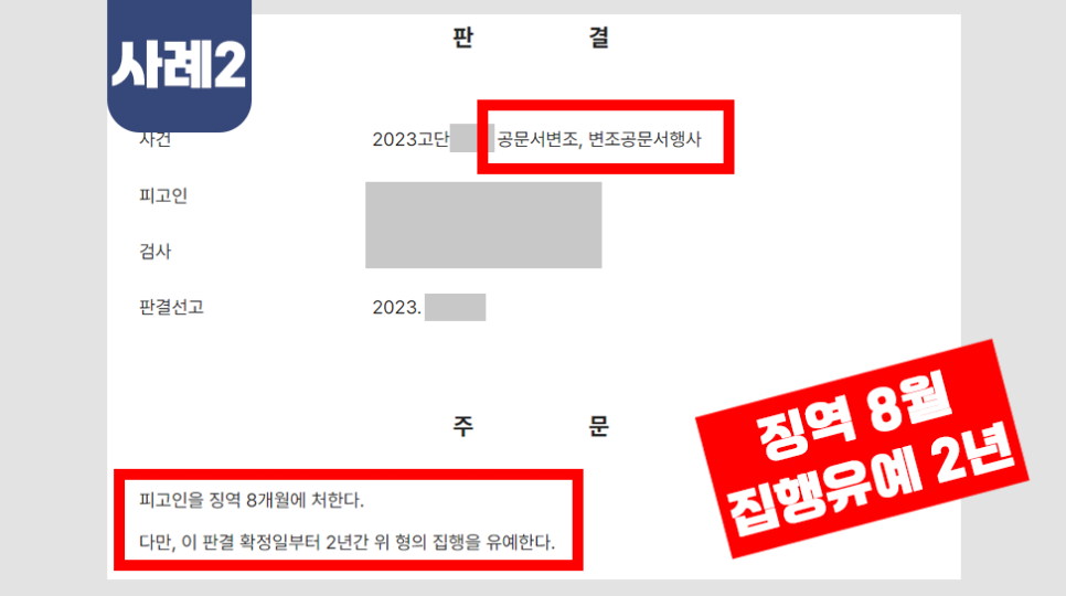 (공문서 변조 및 변조 공문서행사 징역8월, 집행유예 2년 실제판결)