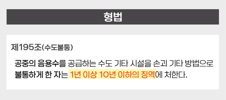 형법 제195조는 공중의 음용수를 공급하는 수도 시설을 손괴 등의 방법으로 불통하게 한 자 를 형사처벌 하도록 하고 있습니다. 수도불통죄는 벌금형이 없고 1년 이상 10년 이하의 징역 으로만 규정하고 있는데, 물을 사용하지 못하게 할 경우 입주민들의 건강과 보건에 심각한 불이익을 초래하기 때문에 중한 징역형만으로만 규정하고 있는 것입니다.