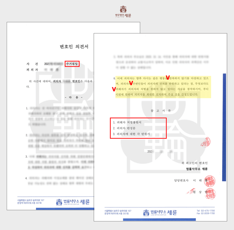 이 중에서 저희는 ▲주거침입의 고의가 없었다는 점을 강력히 주장하였고 ▲여자친구와 재결합 일이 전혀 없어 재범의 우려가 없다는 점과 ▲피해자 처벌 불원서, ▲피의자 반성문, ▲6개의 탄원서를 제출해 선처를 구하였습니다.