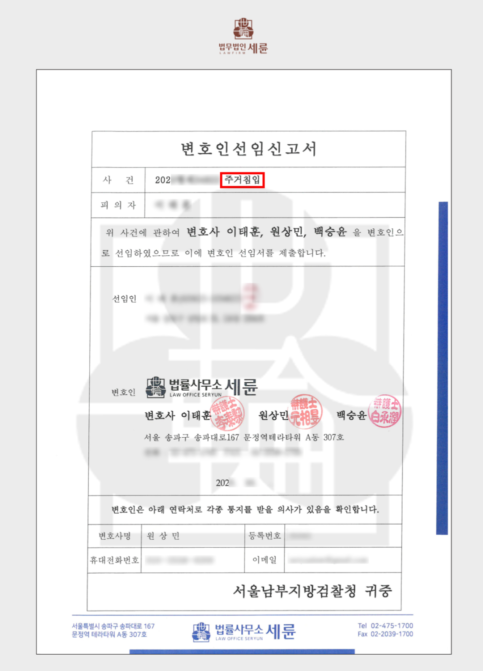 실제로 피의자(의뢰인)는 현관을 세게 두드린다거나 발로 차는 등의 위협적일 수 있는 행동은 하지 않았고 초인종을 누르면서도 오해를 풀 목적으로 현관 앞에서 피해자를 기다렸을 뿐이라며 피해자 '주거의 평온'을 해하였다고 볼 수 없다는 법리를 구성하여 변호인 의견서에 피력하였습니다.