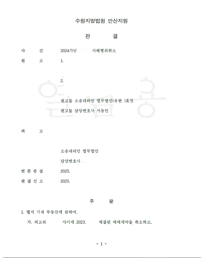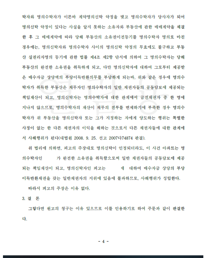 저는 즉각 피고를 상대로 사해행위취소소송을 제기하였고 피고는 명의신탁을 주장하였으나 법원을 이를 배척하고 원고 승소 판결을 선고하여 의뢰인들은 대여금을 변제받게 되었습니다.
