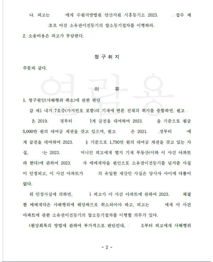 의뢰인들은 채무자에게 대여금 채권이 있었는데 채무자는 자신의 유일재산인 아파트를 어머니인 피고에게 소유권 이전을 하여 의뢰인들은 대여금을 변제받고자 저를 찾아오셨습니다.