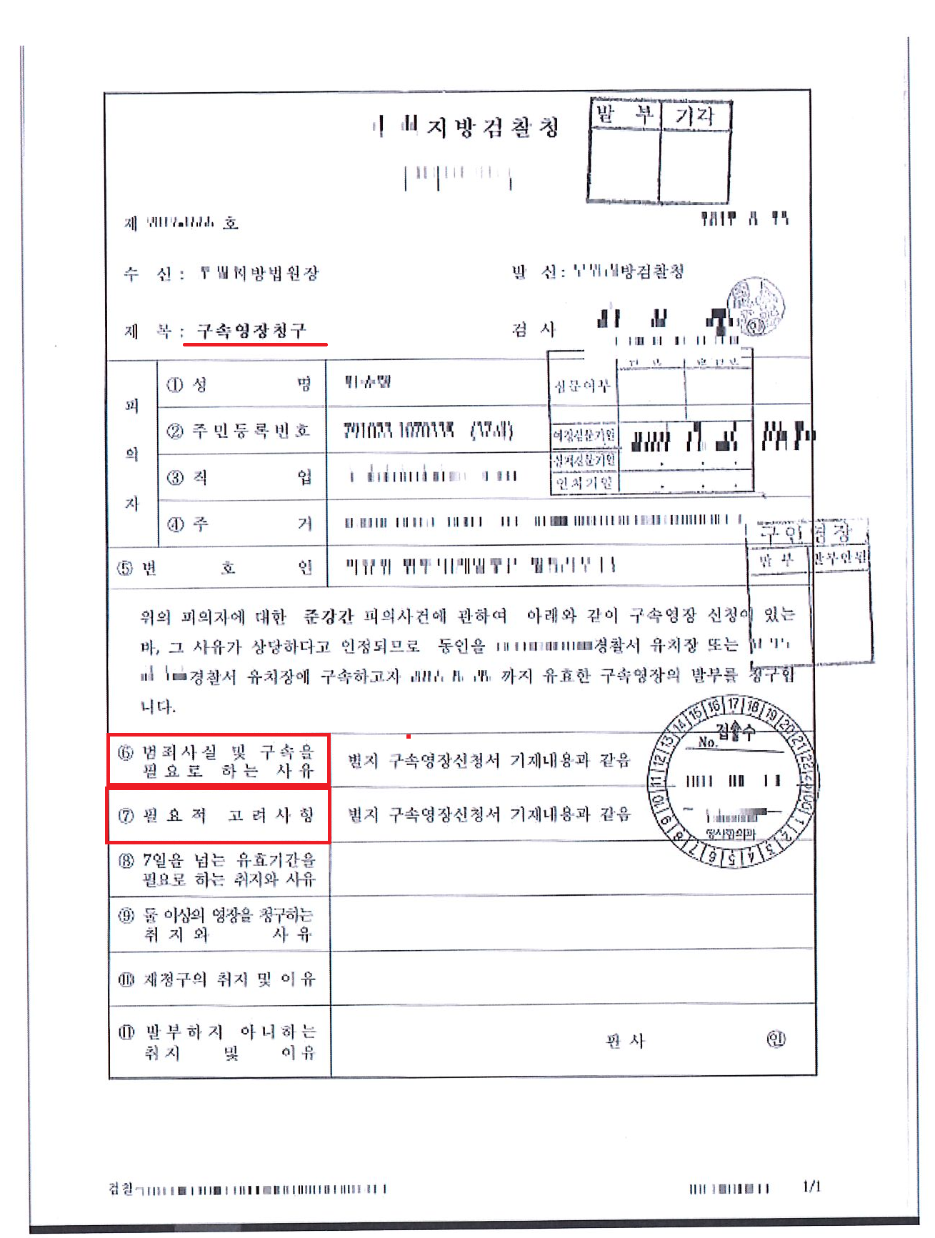 위 서류와 같이 생겼습니다. 편의상 구속영장청구서의 앞 페이지만 올려놨는데요. 뒤에는 무슨 혐의로 왜 구속을 시켰는지 자세히 기제되어있습니다.