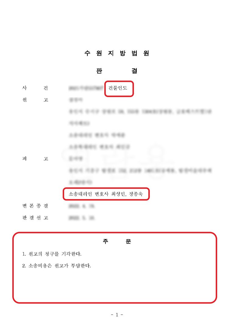 사건을 담당한 재판부는 저희 측 청구의 타당성을 인정하여 상대방의 명도청구를 기각시키는 판결을 선고하였습니다.