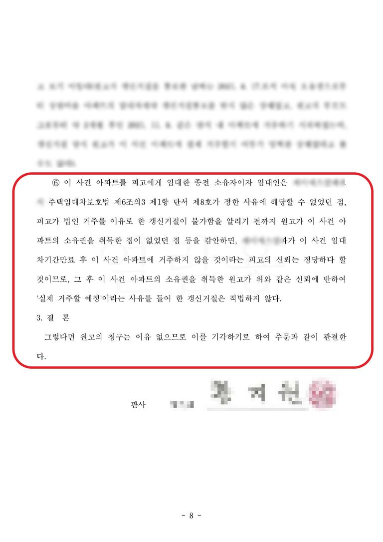 실제로 최근 대법원 판례에서는 '실거주'에 대한 입증책임은 집주인에게 있다는 판결이 나오기도 했습니다. 이 뜻은 집주인이 실거주에 대한 입증을 충분히 해내지 못하거나, 피고가 집주인의 실거주가 진정한 것이 아니라는 사실에 대하여 어느정도 증명을 해내면 충분히 승소할 수 있다는 의미입니다.