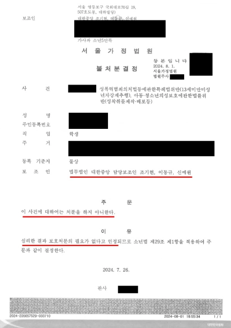 하지만 결과는, 어떠한 보호처분도 없이 사건 자체를 종결하는 ‘불처분’이었습니다.