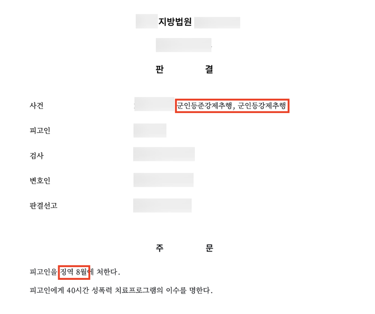 작년 이맘때쯤이었습니다. 군 복무 중이던 피해자들이 뜻하지 않은 방식으로 큰 고통을 겪었고, 저를 찾아와 조심스럽게 그날의 이야기를 꺼냈습니다. 군대라는 폐쇄적 공간 안에서 피해를 입고도 말하지 못하는 시간이 길었던 만큼, 사건을 다룰 때에도 조심스럽고 단단한 접근이 필요했습니다. 이 사건의 피고인은 같은 생활관, 같은 공간에서 잠든 전우의 몸을 수차례 만지는가 하면, 사이버정보방 안에서도 또 다른 피해자의 신체를 접촉하며 명시적 거부에도 행위를 멈추지 않았습니다. 법원은 이러한 일련의 추행이 우발적인 접촉이 아니라 고의적인 범행임을 인정하였고, 피고인에게 징역 8개월과 40시간의 성폭력 치료프로그램 이수를 명했습니다.