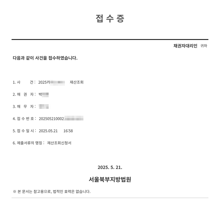 [의뢰현황] 2025년 5월 21일 박**님 재산조회신청 사건위임