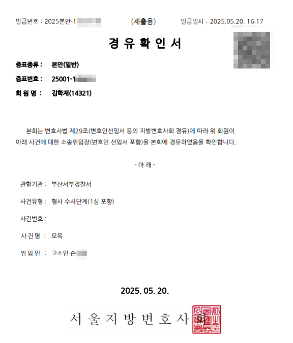[의뢰현황] 2025년 5월 20일 손**님 모욕죄 고소 사건위임