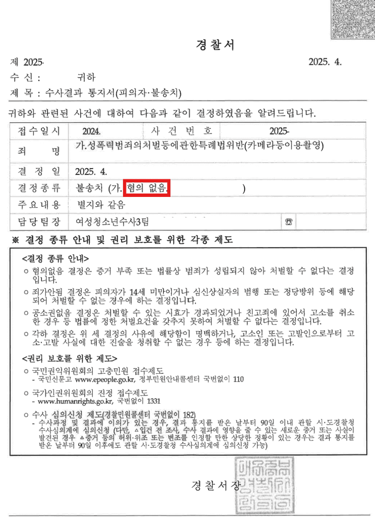 당연한 결과이지만 '무혐의 처분'을 받게 되었고 의뢰인은 일상으로 돌아갔습니다.