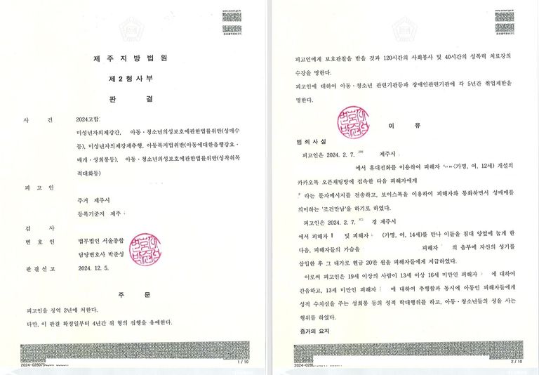 3. 결과 - 성착취목적대화(아청법 위반) 무죄, 나머지 집행유예 (합의없음)