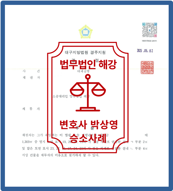 현명한 대처와 전문성을 갖춘 법무법인 해강의 조력으로 저희 법무법인 해강은 의뢰인의 재산보호를 지키고자 하였고 [성공]하였습니다.