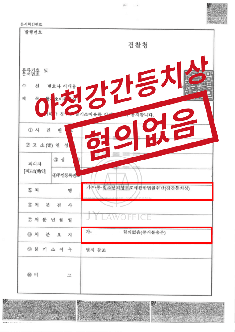 이와 같은 아청법 변호사의 조력에 따라, 의뢰인은 아청법위반(강간등치상)의 혐의에서 혐의없음의 처분을 받고 무사히 사건을 종결시킬 수 있었습니다.