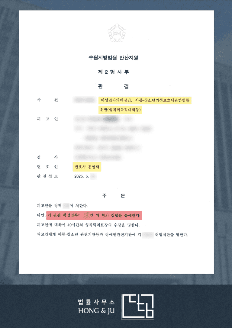 위와 같이 홍영택 변호사가 조력한 결과, 수원지방법원 안산지원은 피해자가 향후 건전한 성적 가치관과 정체성을 형성하는 데 부정적 영향을 받을 것이 분명해 보이고, 이러한 범행 사실을 인지한 피해자의 가족들도 상당한 정신적 충격을 받았을 것으로 보인다며 사건의 중대성을 인정했습니다.