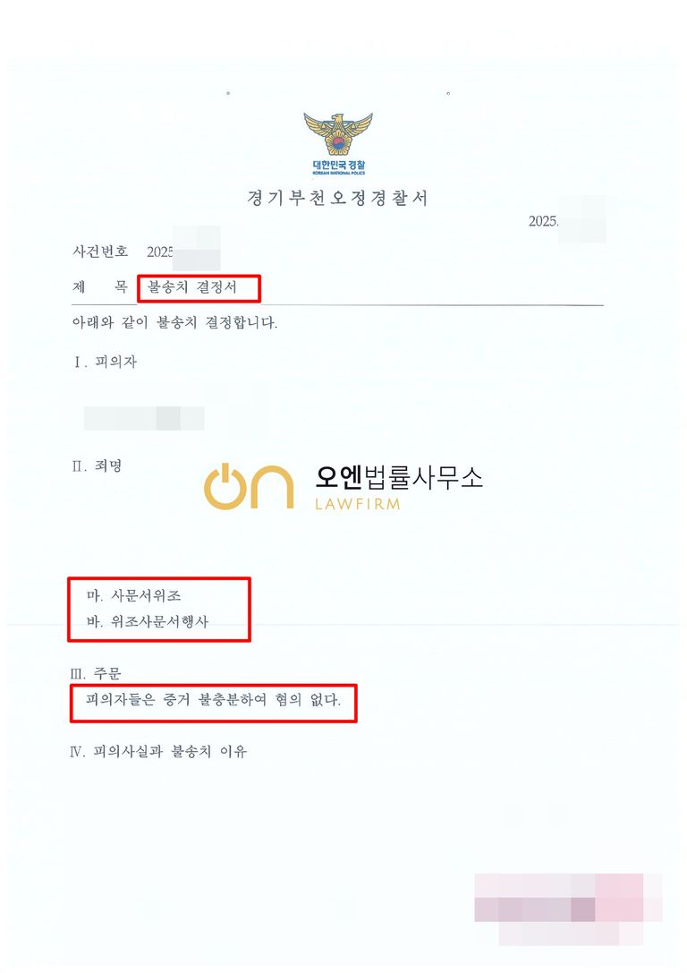 검찰은 오엔법률사무소의 주장을 받아들여, 의뢰인이 명의인인 당사자로부터 적금 해지 및 송금 업무를 위임받고 진행하였기에 당사자로부터 위임 받은 범위 내에서 해지 전표 및 송금 전표를 각 작성 및 행사한 것으로 판단하여 사문서 위조 및 동행사죄 혐의에 대해서 혐의없음 결정을 내렸습니다.