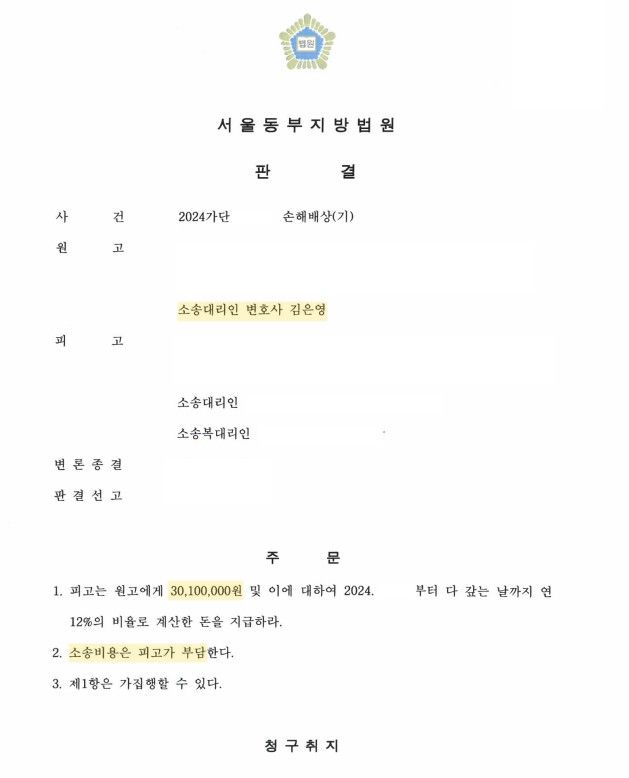 법원은 상간자가 소송 중에도 지속적으로 부정행위를 하고 의뢰인에 대한 무리한 형사고소를 제기함으로써 계속하여 정신적 고통을 가한 사실을 인정하며, 원고 청구 전부를 인용하였습니다. 의뢰인은 위자료 전액이 인용되고 소송 비용까지 피고에게 청구할 수 있는 것에 크게 만족해하였습니다.