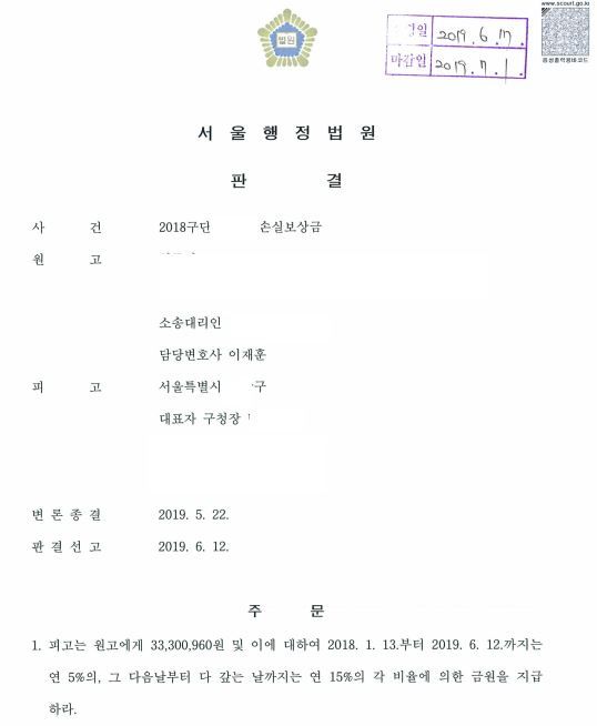 서울특별시 ㅇㅇ구를 상대로 한 손실보상금 사건에서 승소한 사안