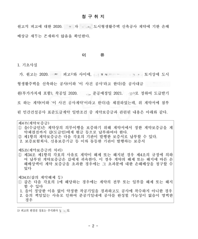 의뢰인은 도급인으로서 수급인인 원고와 주택신축공사에 관한 도급계약을 체결하였는데 계약서에는 원고의 귀책으로 계약이 해제된 경우 계약이행보증금 등이 의뢰인에게 귀속된다고 규정하였습니다.