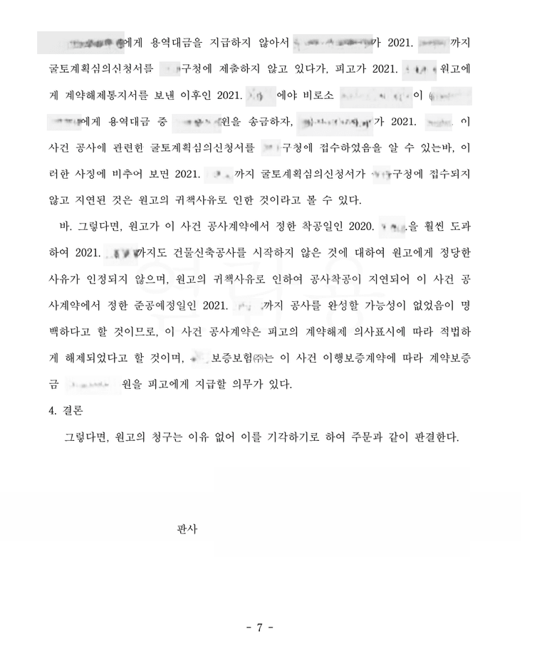 그런데 원고는 한참이 지나도 착공조차 하지 않았고 이에 의뢰인은 원고에게 계약 해제를 통보하였으며 보증보험회사에 계약이행보증보험금을 청구하였는데 그러자 원고는 갑자기 의뢰인에 대한 채무가 부존재한다는 이 사건 소를 제기하였습니다.